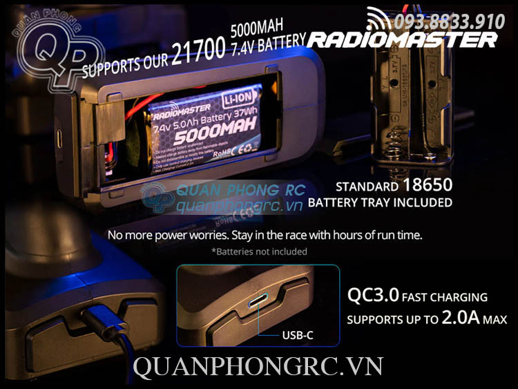 - Ngăn chứa pin quá khổ - 2 x 18650 cell hoặc bộ pin 2s 7.4v 5000mah (Không bao gồm pin)