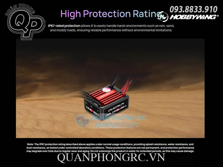 - ESC đạt chuẩn chống nước IP67, có thể hoạt động tốt trong các điều kiện môi trường khắc nghiệt như mưa, cát, hay đường bùn lầy, đảm bảo hiệu năng ổn định không bị giới hạn bởi điều kiện thời tiết.