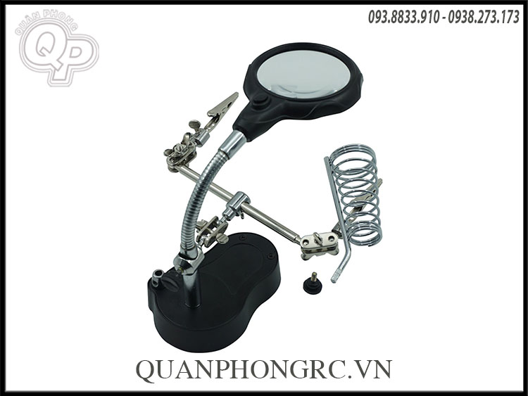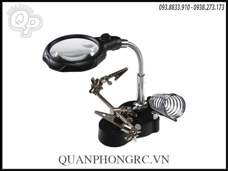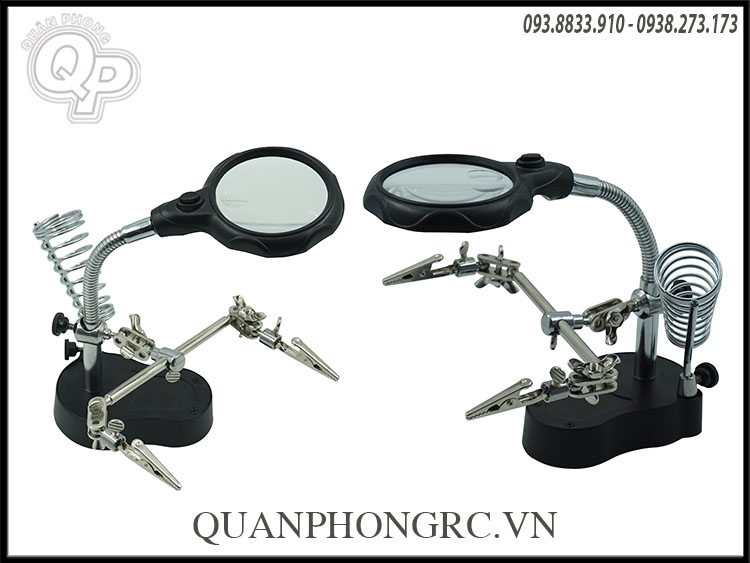 Helping hand magnifier with 2 led lights and soldering stand. A useful aid for soldering jobs and inspection work. Can also be used for model making, jewellery making, watch repairs and craft work. Moveable arms and adjustable crocodile holding clamps allowing for hands free use. 2 led lights provide illumination and a heavy duty base provides stability. Requires 3 x AO545:AS709 batteries (not included).