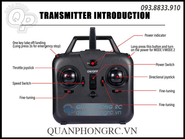 6. 4-channel remote control, low voltage alarm, locked rotor protection, out-of-control protection, large and small rudder quantity conversion, one-key take-off, one-key landing and other functions.
