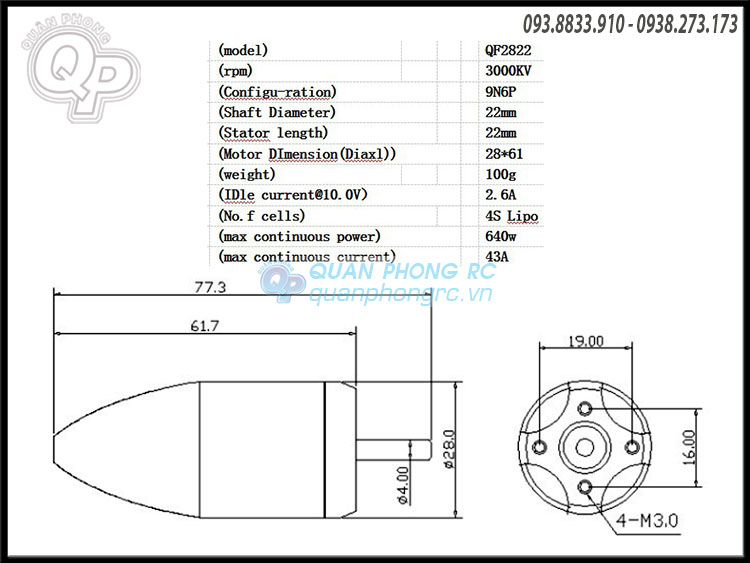 Kích thước động cơ: 28x61mm / 1.1x2.4in