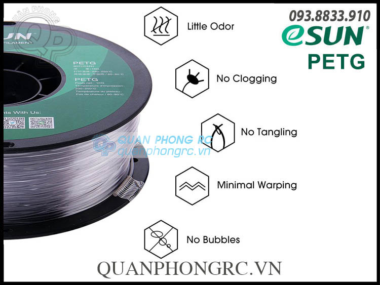 Sợi nhựa PETG là một trong những loại vật liệu mới cho in 3D được đánh giá tốt nhất hiện nay. Sợi nhựa PETG có thể chịu nhiệt tốt như ABS (80oC), dễ sử như nhựa PLA và là một trong những vật liệu in 3D cứng nhất trong bảng xếp hạng.