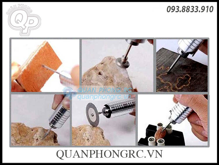 - Đầu kẹp mũi khoan dùng để kẹp các loại mũi khoan mài, cắt, khắc có kích thước phong phú từ 0.3~4mm kết hợp với các loại dây truyền động và máy khoan mài khắc để chế tác đồ trang sức, đồ thủ công mỹ nghệ, đồ cổ & các mục đích khác.
