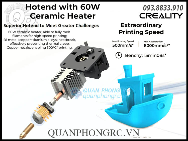 - Hotend vượt trội để đáp ứng những thách thức lớn hơn: bộ gia nhiệt gốm 60W có khả năng làm tan chảy hoàn toàn sợi nhựa để in tốc độ cao; Tản nhiệt lưỡng kim (đồng + titan), ngăn ngừa hiện tượng rão nhiệt; Đầu phun bằng đồng, cho phép in ở nhiệt độ 300°C.