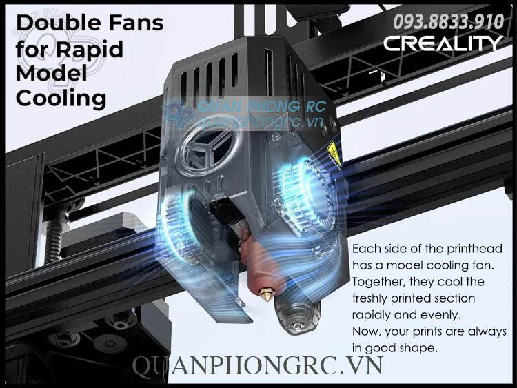 - Quạt đôi để làm mát mô hình nhanh: Mỗi bên của đầu in có một quạt làm mát mô hình. Cùng nhau, chúng làm mát phần mới in một cách nhanh chóng và đồng đều. Bây giờ, bản in của bạn luôn ở trạng thái tốt.