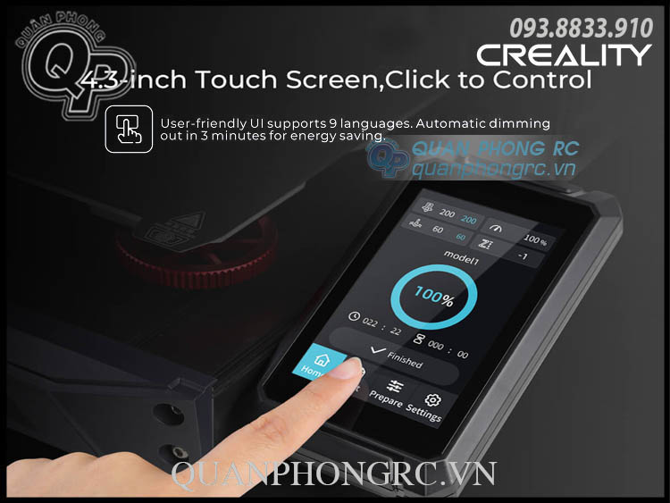 Ender-3 S1 Plus cũng được trang bị màn hình cảm ứng màu 4,3 inch tích hợp giao diện người dùng có thể truy cập hỗ trợ 9 ngôn ngữ, bao gồm tiếng Anh, tiếng Tây Ban Nha, tiếng Đức và tiếng Pháp. Màn hình thân thiện với môi trường sẽ tự động mờ đi sau ba phút nếu không sử dụng, giúp tiết kiệm năng lượng hơn. So với màn hình núm xoay của Ender-3 S1, nó mang lại trải nghiệm nhấp chuột để điều khiển liền mạch cho người dùng.