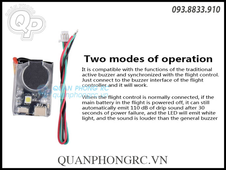 - Khi FC được kết nối bình thường, nếu pin chính của quad bị tắt nguồn thì còi vẫn có thể tự động phát ra âm thanh 110 dB sau 30 giây mất điện và đèn LED sẽ phát ra ánh sáng trắng.