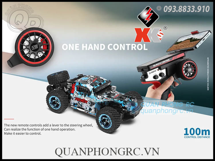 3. Tay điều khiển từ xa nâng cấp V8: hệ thống vô tuyến 2.4 GHz với khả năng chống nhiễu cho phép nhiều xe đua cùng một lúc trong cùng một đường đua. Khoảng cách điều khiển 100 mét. Có giá đỡ điện thoại đi tích hợp sẵn.