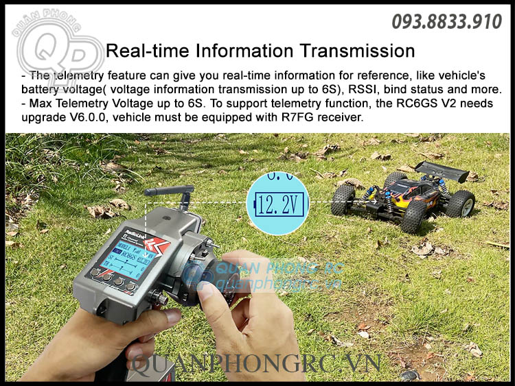 - Vehicle voltage will display by connecting the wire to the ESC, battery and BAT port of receiver R7FG/R8F, no extra module needed.