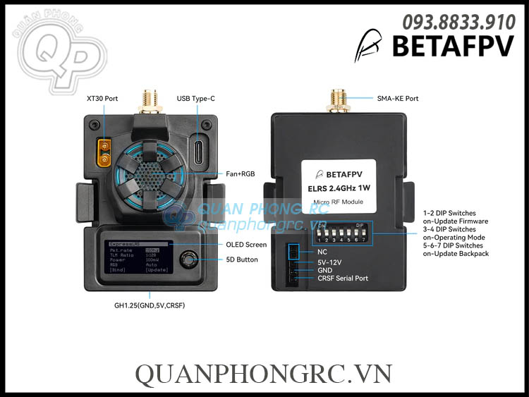 The black version with maximum 1W RF output power is released now. Support all 5D button dimensions based on BETAFPV ELRS V2.0.0 firmware. A new backpack function is added, allowing wireless communication between ExpressLRS, and other FPV related devices for command and control, or for querying config.