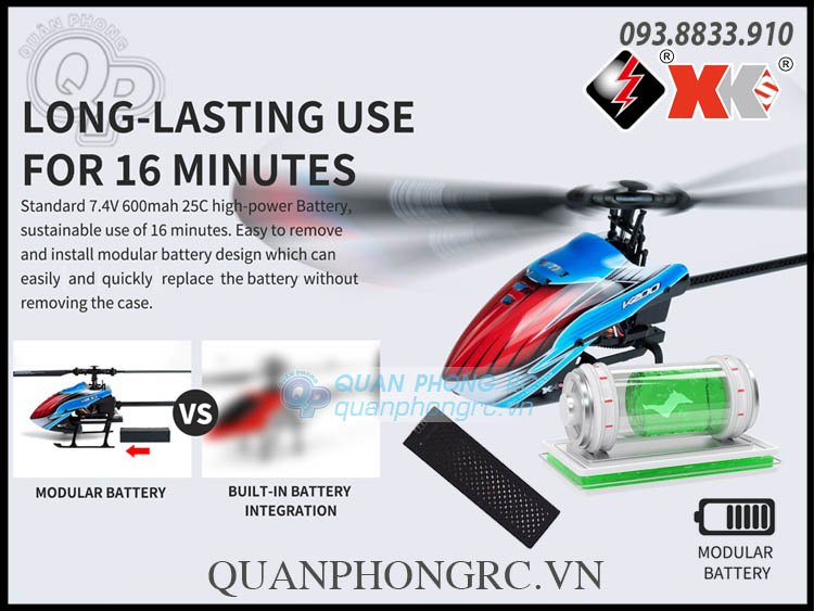 2. Sử dụng động cơ chổi than carbon 050 cộng với tản nhiệt bảo vệ giúp nâng cao tuổi thọ động cơ. Pin tiêu chuẩn 7.4V 600mAh 25C với đầu cắm sạc USB. Mỗi lần sạc đầy pin có thể bay khoảng 16 phút.