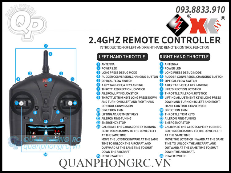 - Điều khiển từ xa: 2.4G(có thể chuyển đổi tay trái và tay phải)