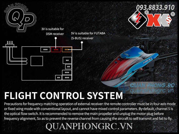 7. Mạch điều khiển bổ sung 2 ổ cắm chuyển đổi bộ thu sóng mới: 5V dùng cho các cổng FUTABA (S-BUS) và các cổng (S-BUS) khác; 3V phù hợp với đầu thu DSM.