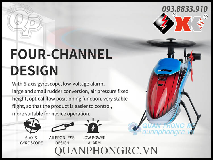 1. Không có cánh phụ, thiết kế 4 kênh đơn giản, sử dụng con quay hồi chuyển 6 trục, với chức năng định vị quang học và định áp độ cao. Thiết kế của thiết kế nguyên lý khí lực là sức mạnh mạnh mẽ và sự tự ổn định của máy bay. Có chức năng cất cánh và hạ cánh bằng một nút, giúp điều khiển dễ dàng hơn và phù hợp hơn cho người mới chơi.