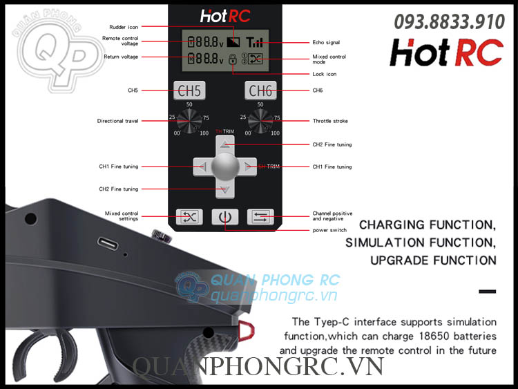 Tay Điều Khiển HOTRC CT-6A 6CH 2.4G FHSS RC Transmitter Cho Xe Và Tàu + Rx 6CH