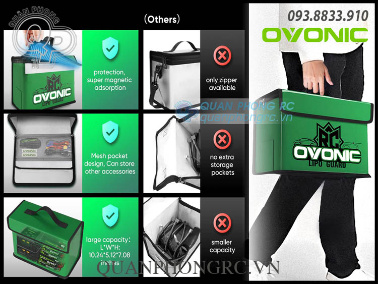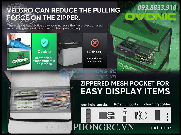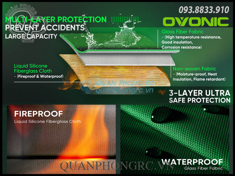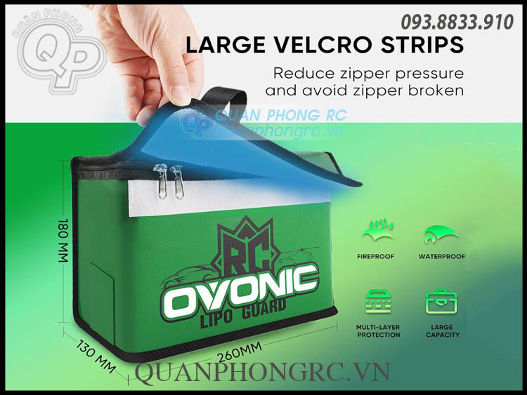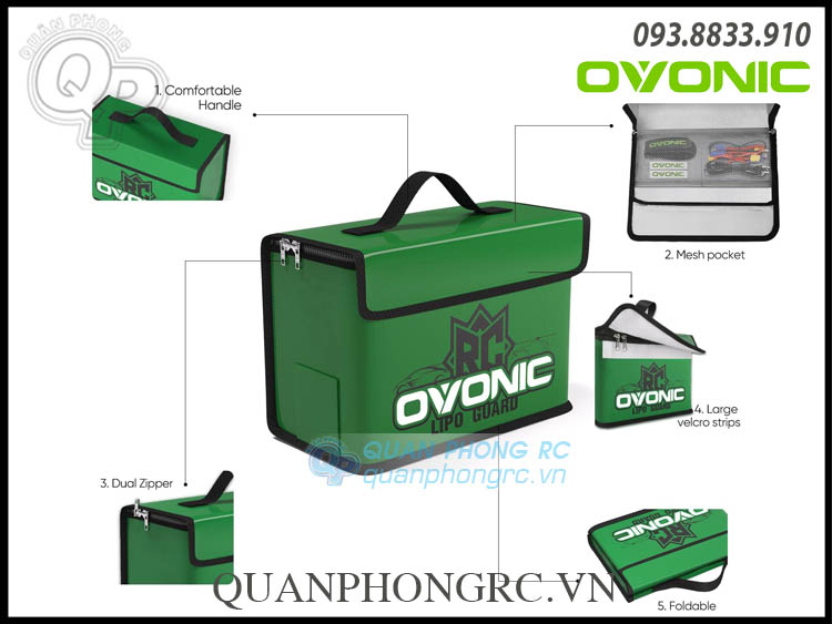 - Giới thiệu Túi an toàn LiPo chống cháy nổ Ovonic - giải pháp tối ưu để bảo quản, vận chuyển và sạc pin LiPo một cách an toàn. Chiếc túi chất lượng cao này được làm từ vải silicon lỏng chống cháy, vải không dệt và vải sợi thủy tinh, mang lại khả năng chống cháy tuyệt vời cả bên trong lẫn bên ngoài, khả năng chịu nhiệt độ lên tới 1000℉.