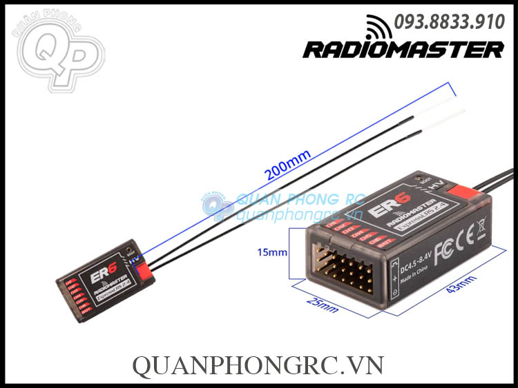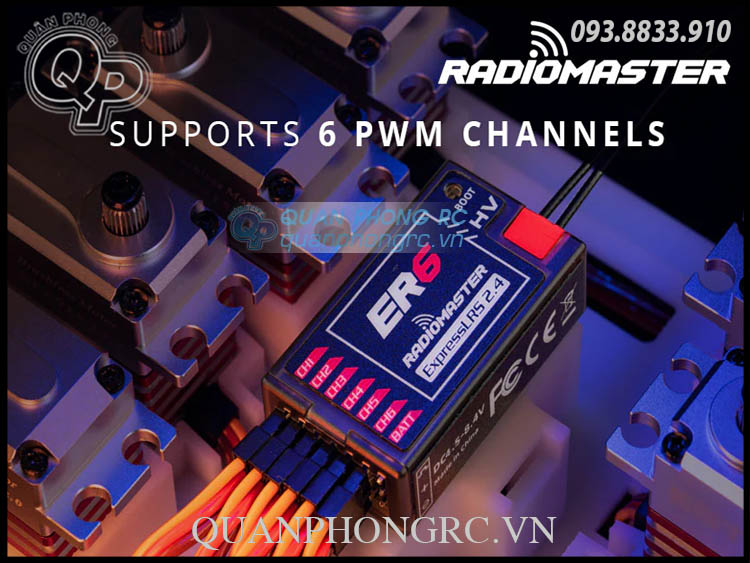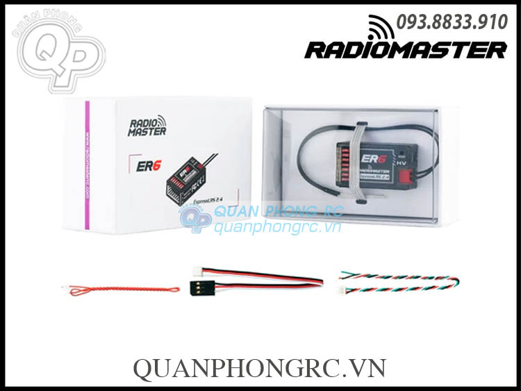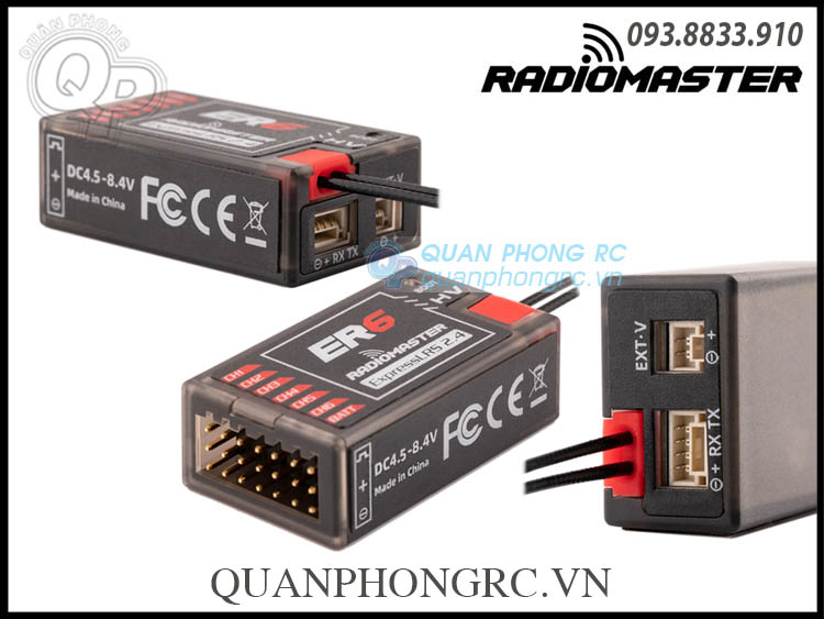 - Bộ thu Radiomaster ER6 được thiết kế đặc biệt cho người chơi cánh bằng. Nó có thể điều khiển tối đa 6 động cơ servo và được tích hợp chức năng đo từ xa điện áp máy thu và pin chuyến bay với khả năng tự động phát hiện đầu vào điện áp nào sẽ sử dụng. Giao diện CRSF 4 dây được cung cấp để hỗ trợ việc mở rộng cảm biến đo từ xa sau này. ER6 có ăng-ten kép với công suất đo từ xa lên tới 100 mw. Vỏ máy thu áp dụng quy trình đúc một mảnh với độ bền kết cấu cao.