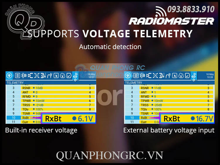 - Automatically voltage telemetry of external battery voltage or built-in receiver voltage