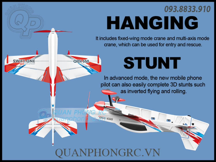 1. Bộ máy bay cánh bằng full combo QIDI-550 với chức năng kháng gió tốt, mạch cân bằng hỗ trợ bay và nhào lộn 3D6G, đặc biệt chức năng treo 3D Vertical mode chỉ với 1 nút gạt..