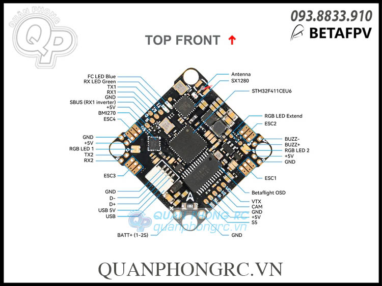 - Built-in current meter, 2 programmable RGB LEDs, and SPI Frsky receiver. At the same time, all the pads are left for the external receivers with UART1 and UART2, for buzzers, etc.