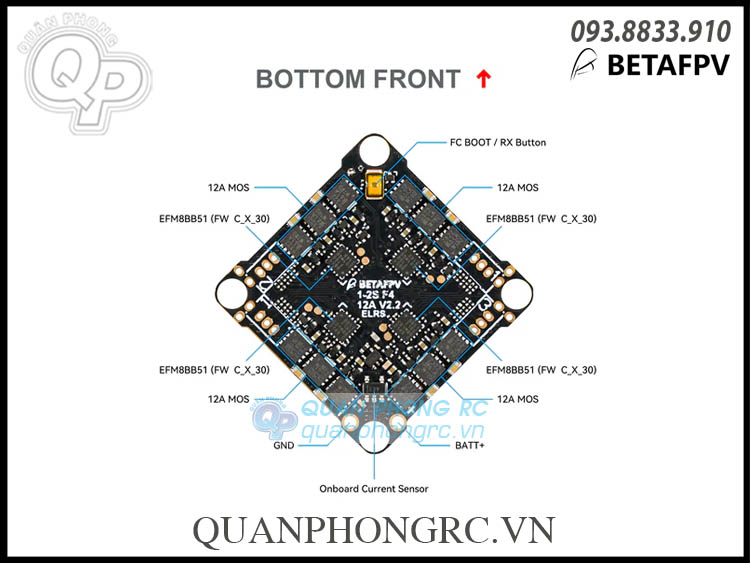 F4 1S 12A FC board comes with the default firmware betaflight_4.3.1_BETAFPVF4SX1280 (ELRS) or betaflight_4.2.11_BETAFPVF411RX (Frsky). The default firmware for SPI ELRS 2.4G RX version supports ELRS V2.0 RX.