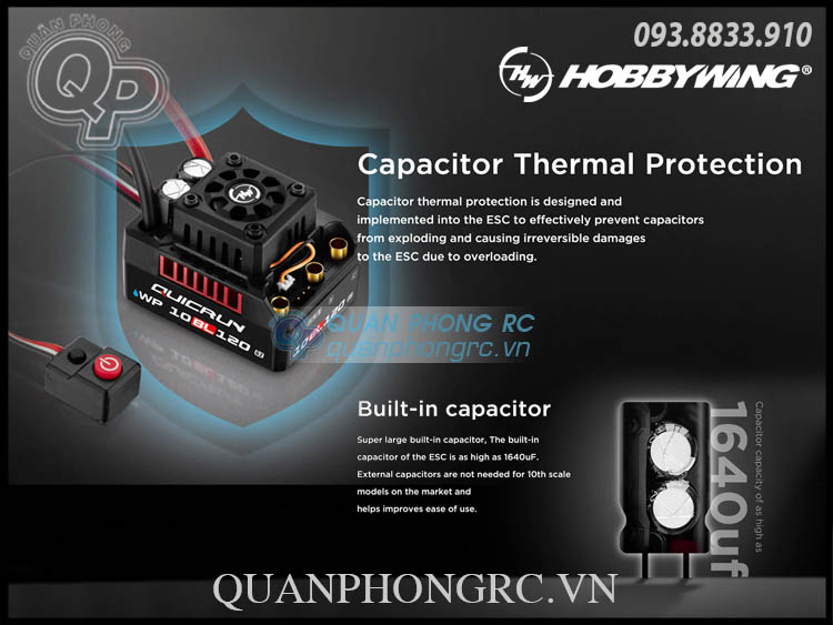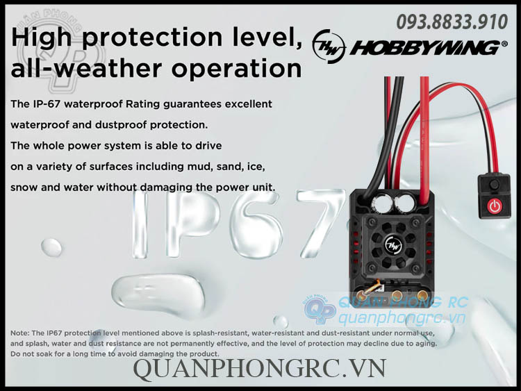 ESC này được xếp hạng chống nước IP-67 để đảm bảo khả năng chống nước và bụi tuyệt vời. Toàn bộ hệ thống điện có thể hoạt động trên nhiều bề mặt khác nhau bao gồm bùn, cát, băng, tuyết và nước mà không làm hỏng bộ nguồn. Tụ điện tích hợp cải thiện cả hiệu suất và khả năng bảo vệ mất điện. ESC cũng có tính năng bảo vệ nhiệt tụ điện và hỗ trợ bảo vệ ESC và các tụ điện của ESC khỏi bị nổ do quá tải.