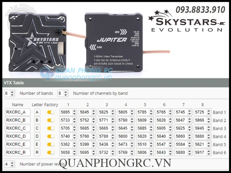 - Giá trị bảng VTX: 25mW/400mW/800mW/1600mW