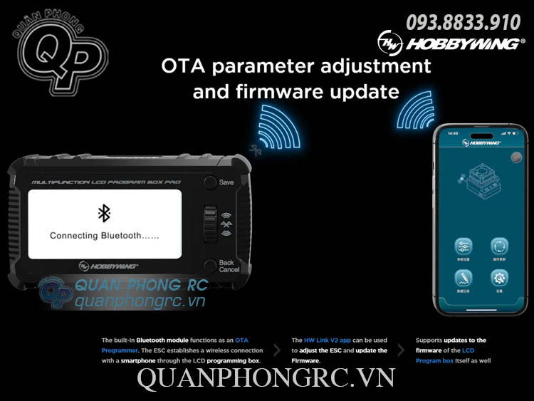 - The OTA Bluetooth™ module: Using the mobile APP to set ESC parameters, upgrade firmware, and read data.
