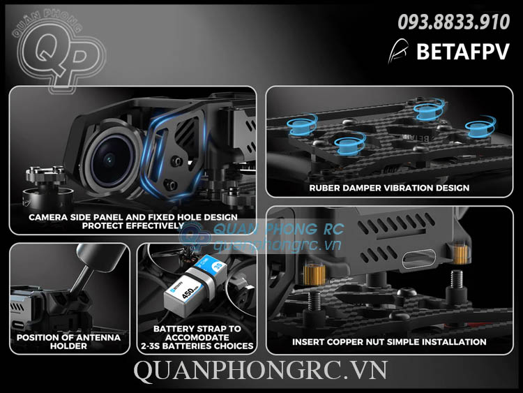 - An open-ended battery strap slot that accommodates 2~3S batteries* while keeping side-limitation slots ensures stability.