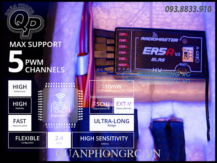 - Bộ thu ER5A V2 dựa trên hệ thống ExpressLRS hiệu suất cao, mang tính cách mạng, có độ tin cậy cao, cấu hình linh hoạt cao, tốc độ phản hồi cực nhanh và phạm vi thu cực dài, mang đến trải nghiệm sử dụng hoàn toàn mới.