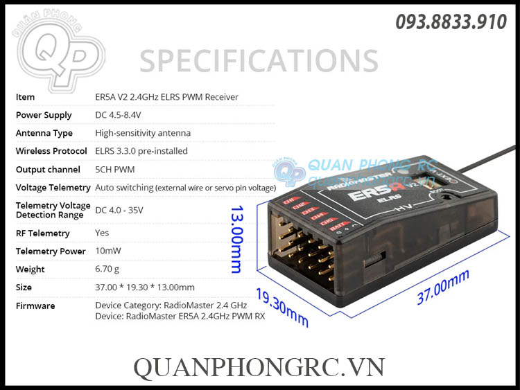 - Sản phẩm: Bộ thu ER5A V2 2,4 GHz ELRS PWM