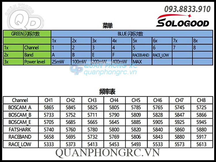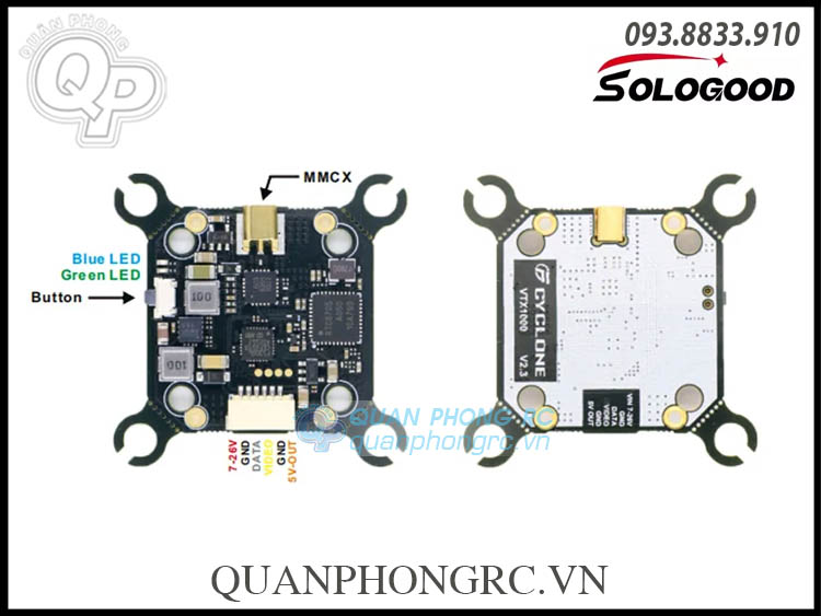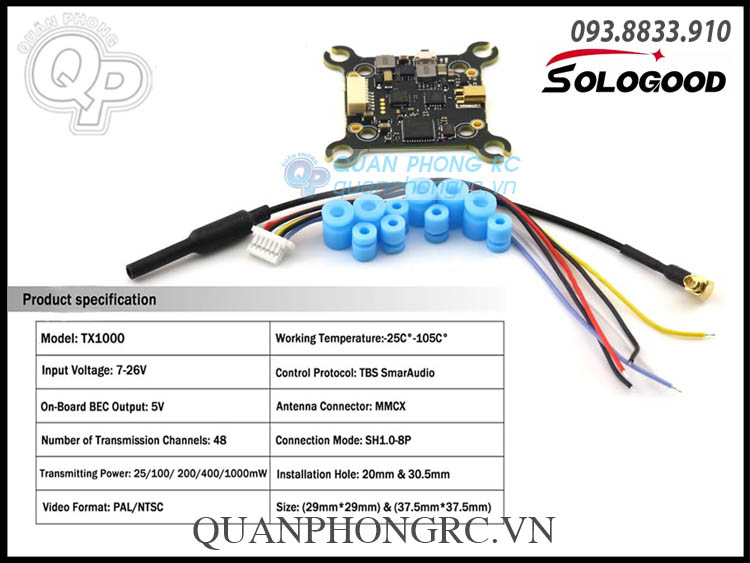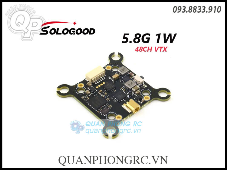 - Sản phẩm có ăng-ten SoloGood 5.8G 1W 48CH VTX với dải điện áp đầu vào là 7-26V và các tùy chọn công suất truyền là 25, 100, 200 hoặc 400mW. Ngoài ra, nó bao gồm một đầu nối TOPMB/BOTMB/MMCX, đèn báo LED màu xanh lam, điều khiển từ xa 61 nút và đèn pha LED tăng sáng cao với 283 lumen.