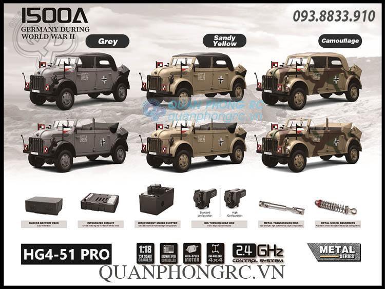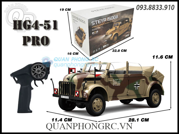 The Steyr 1500A was a battlefield command vehicle for high-ranking officers, but also partly a vehicle for high-ranking German officials during World War II. Later, some 1500A were converted into troop carriers, medical escorts, and transporting soldiers and weapons. The HG4-51 PRO is a 1:18 scale Steyr 1500A simulation vehicle, with an alloy chassis and exquisite simulation details, suitable for both die cast model collection and remote control with a detailed, unique and sophisticated design.