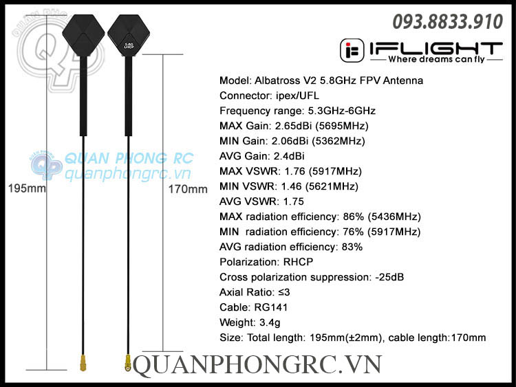 iFlight Albatross V2 5.8GHz FPV Antenna 170/195mm - IPEX/UFL RHCP (1 Cái)