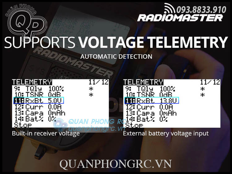 - Tự động phát hiện đo từ xa điện áp của điện áp pin ngoài hoặc điện áp pin bộ thu / ESC BEC