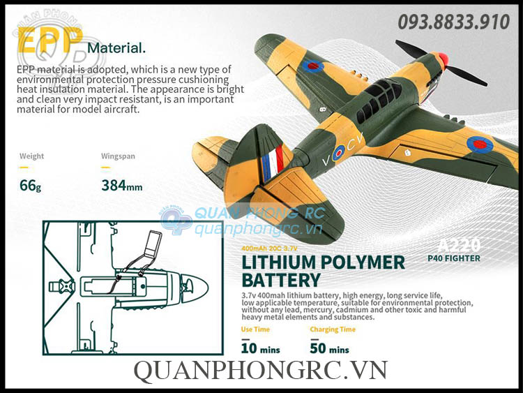 - Pin máy bay: LI-POLY 3.7V (400MAH) 20C