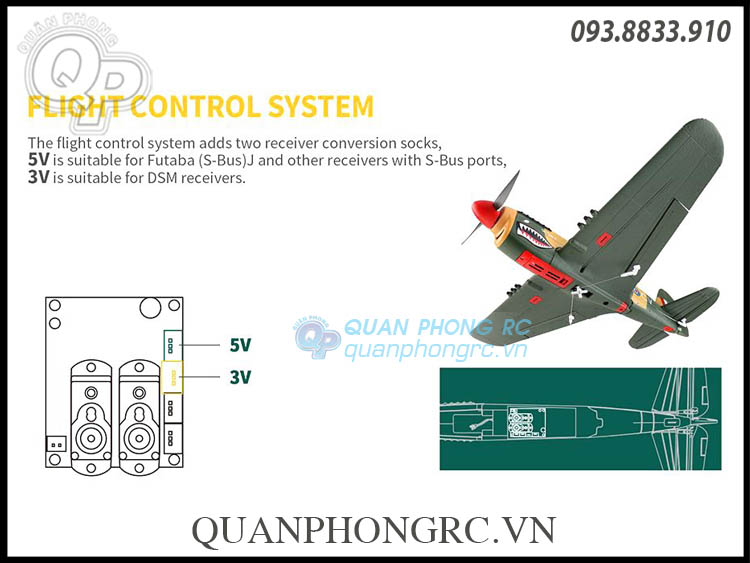 - It is scaled down based on the actual P40 fighter jet. The four-channel design is simple and easy to learn. The aileron channel controls the aircraft to turn left and right, the elevator controls the aircraft to climb and descend, and the throttle channel controls the speed of the aircraft. The direction controls the plane to turn left and right in a circle. The blades, motors, and wings are detachable for easy replacement. The flight control system adds two receiver conversion sockets. 5V is suitable for FUTABA (S-BUS) J and other receivers with (S-BUS) ports, and 3V is suitable for DSM receiver.