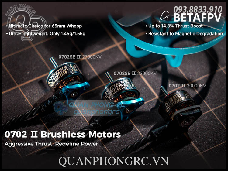 - The 0702SE II motors feature brass bushings, making it both lightweight at 1.45g (23000KV) and 1.47g (27000KV) and highly efficient. This more affordable and durable motor is the perfect choice for extremely lightweight installations.