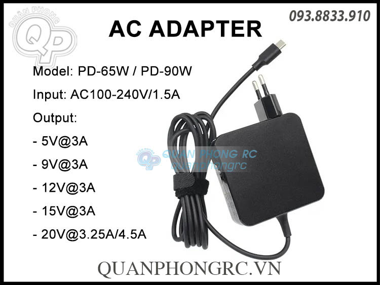 - Điện áp đầu ra: 5V-3A; 9V-3A; 12V-3A; 15V-3A; 20V-3.25A/4.5A