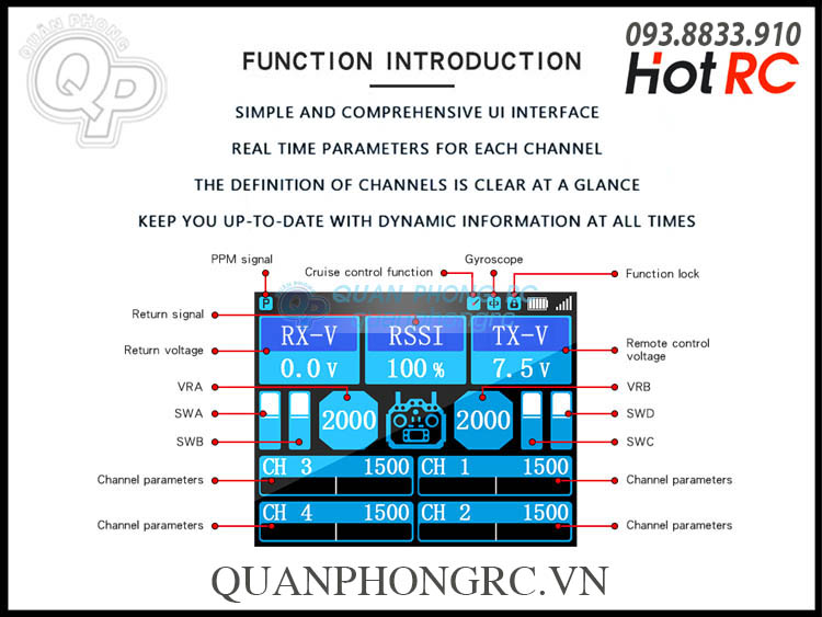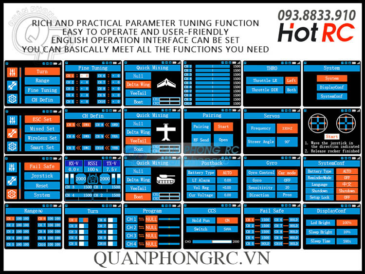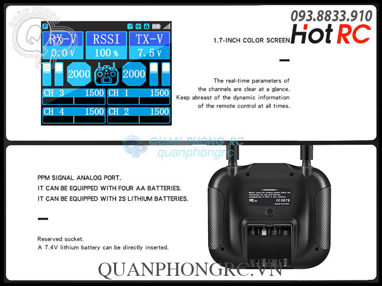 - Hỗ trợ 2 chế độ nguồn điện, giao diện hiển thị bằng cả tiếng Trung và tiếng Anh dành cho pin AA và pin lithium 2S, có chức năng bảo vệ an toàn khi mất tín hiệu, chức năng nâng cấp trực tuyến và chế độ hành trình.