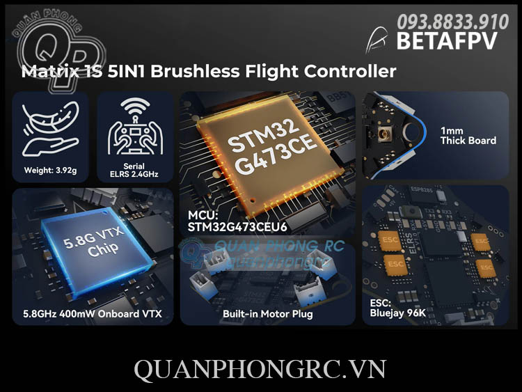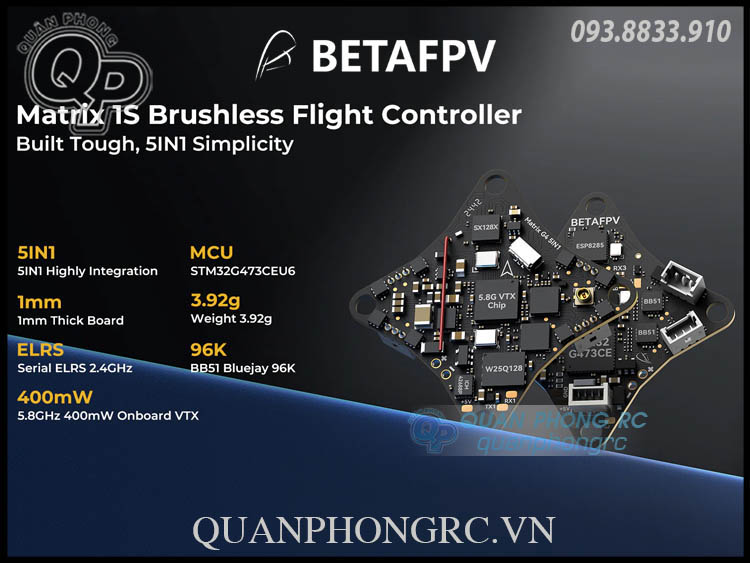 - Hiệu Suất Nâng Cấp: Được trang bị bộ vi xử lý G473, Matrix 1S Brushless FC đạt mức tăng tốc xử lý 55% so với F411, mang lại phản hồi nhanh chóng cho các pha đua và bay tự do phức tạp.