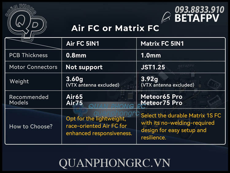 Bộ điều khiển bay không có chổi Matrix 1S được thiết kế hướng đến người mới, với độ bền và hiệu suất được cải thiện so với bộ điều khiển F4 1S 5A AIO ban đầu. Với bo mạch dày 1mm, Matrix 1S mạnh mẽ hơn bo mạch dày 0.8mm của F4 1S 5A AIO, và các đầu nối động cơ tích hợp sẵn giúp việc lắp đặt trở nên đơn giản, không cần hàn. Với bộ vi xử lý G473 tiên tiến và cấu hình 5IN1, bao gồm cả VTX 5.8GHz 400mW, Matrix 1S là lựa chọn tốt hơn cho người mới bắt đầu. Đối với các phi công nâng cao tìm kiếm trải nghiệm bay cực nhẹ và tập trung vào đua, phiên bản Air Brushless FC 5IN1 là lựa chọn tối ưu.