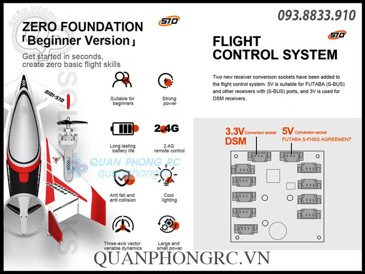 Hệ thống điều khiển bay: Được bổ sung hai cổng chuyển đổi thu sóng mới. Nguồn 5V tương thích với FUTABA (S-BUS) và các bộ thu khác có cổng S-BUS; nguồn 3V dùng cho các bộ thu DSM.