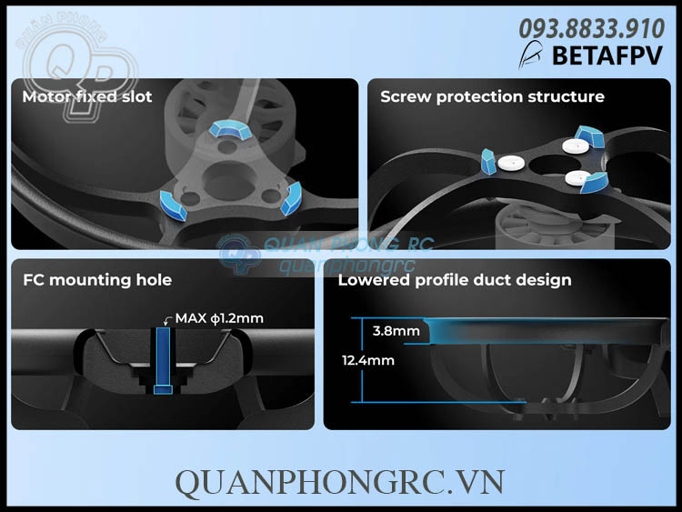 Chi tiết tập trung cho phi công: khe cố định động cơ, cấu trúc bảo vệ vít, lỗ gắn FC lớn (25.5 × 25.5mm), ống dẫn hạ thấp.