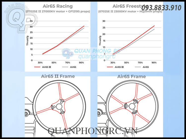 Trong gần hai năm, Air65 Frame đã định nghĩa sự linh hoạt siêu nhẹ. Giờ đây, được phát triển cùng cộng đồng phi công toàn cầu, Air65 II Frame (2.65g) tái định hình hoàn toàn thiết kế. Đội ngũ R&D đã phân tích từng thanh giằng, hình học ống dẫn và điểm va chạm. Kết quả? Một khung máy vừa đột phá vừa tinh chỉnh: 4 thanh giằng thay cho 6, kết hợp với ống dẫn và cấu trúc kết nối tối ưu. Điều này vừa giảm biên độ rung, vừa tăng 5% lực đẩy, đồng thời mang lại phản hồi PID gần như hoàn hảo.