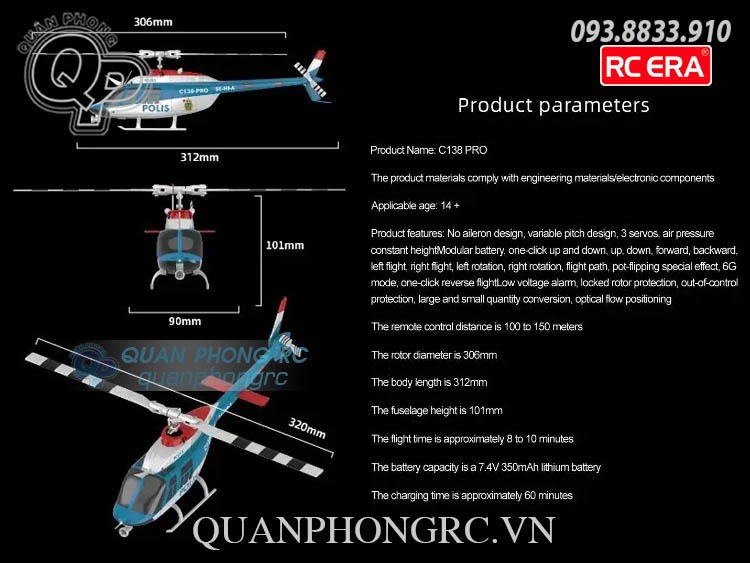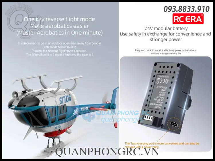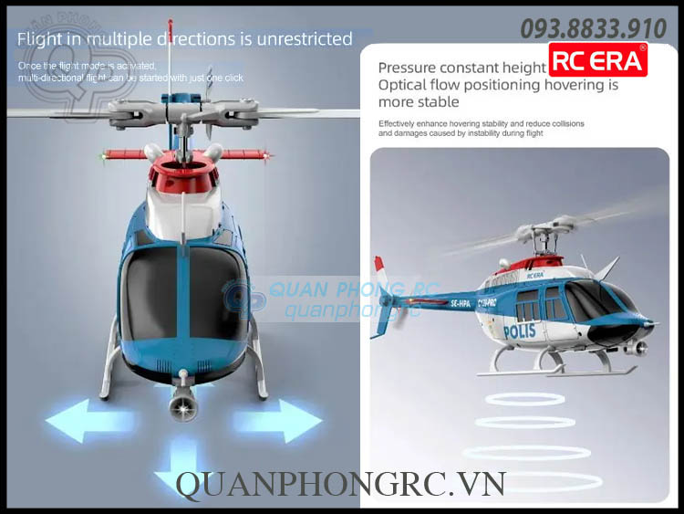 RC ERA C138 Pro Bell206 nổi bật với thiết kế không thanh cân bằng (Flybarless) mang lại khí động học tối ưu, kết hợp với con quay hồi chuyển 6 trục giúp chuyến bay cực kỳ ổn định. Động cơ chính không chổi than cung cấp công suất mạnh mẽ, trong khi hệ thống giữ độ cao bằng áp suất khí + định vị quang học đảm bảo khả năng lơ lửng và điều hướng chính xác. Trang bị tính năng bay ngược chỉ với một nút bấm, mang lại trải nghiệm nhào lộn đầy phấn khích. Đây là lựa chọn hoàn hảo cho những người đam mê trực thăng RC.