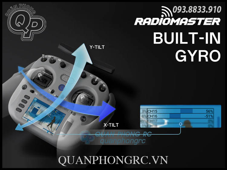 Cảm biến con quay hồi chuyển: Cho phép kích hoạt công tắc, điều khiển góc camera, hoặc thông báo telemetry chỉ bằng thao tác nghiêng tay.