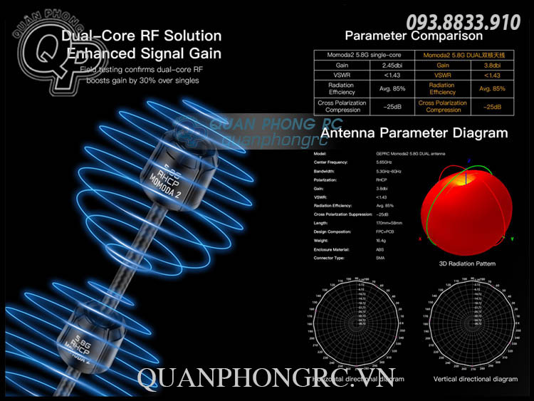 Ăng-ten GEPRC Momoda2 5.8G DUAL sử dụng giải pháp RF lõi kép nhằm tăng cường độ khuếch đại và mở rộng phạm vi phủ sóng. Qua thử nghiệm thực tế, sản phẩm cho thấy khả năng tương thích định hướng được cải thiện rõ rệt. Ăng-ten Momoda2 5.8G DUAL đảm bảo tín hiệu hình ảnh ổn định và đáng tin cậy trong khi bay, đồng thời tăng khoảng cách truyền dẫn.