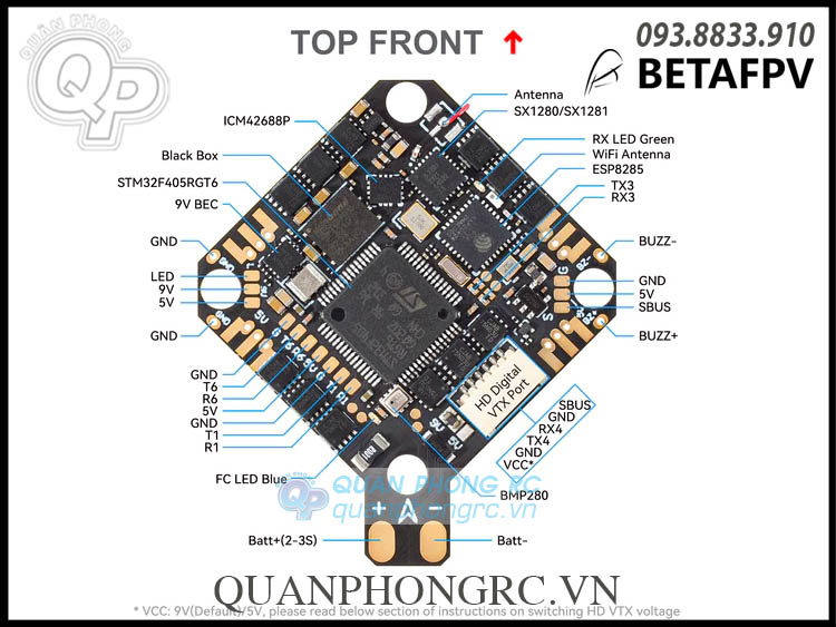 - Designed for HD VTX, it features a dual 9V@2A for DJI O3 and 5V@3A for external device BEC solution to prevent screen blackout on the DJI O3 due to low voltage during throttle increase.