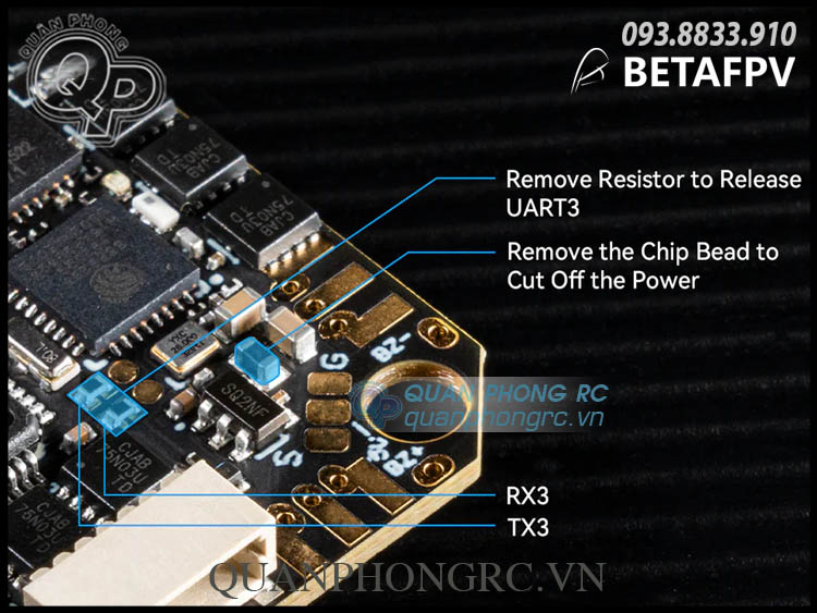 UART3 release: Removing two resistors on the solder pads releases UART3. The left side is TX3, and the right side is RX3. To reconnect, solder the solder pads together when reusing the onboard ELRS receiver.